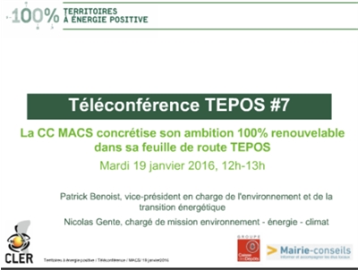 Le mardi 19 janvier 2016 de 12h à 13h, la CC Maremne Adour Côte-Sud est intervenue pour la septième téléconférence Web destinée aux élus et à leurs collaborateurs qui recherchent des références et des pratiques concrètes pour avancer dans leur transition énergétique territoriale.